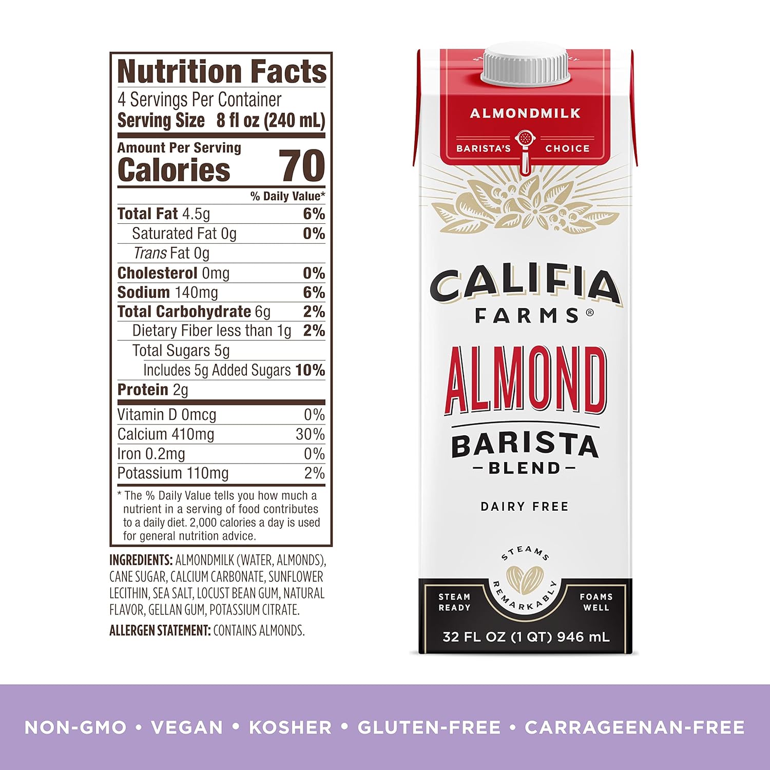 - BARISTA'S CHOICE: Creamy almond milk steams and froths beautifully for full espresso drink flexibility.
