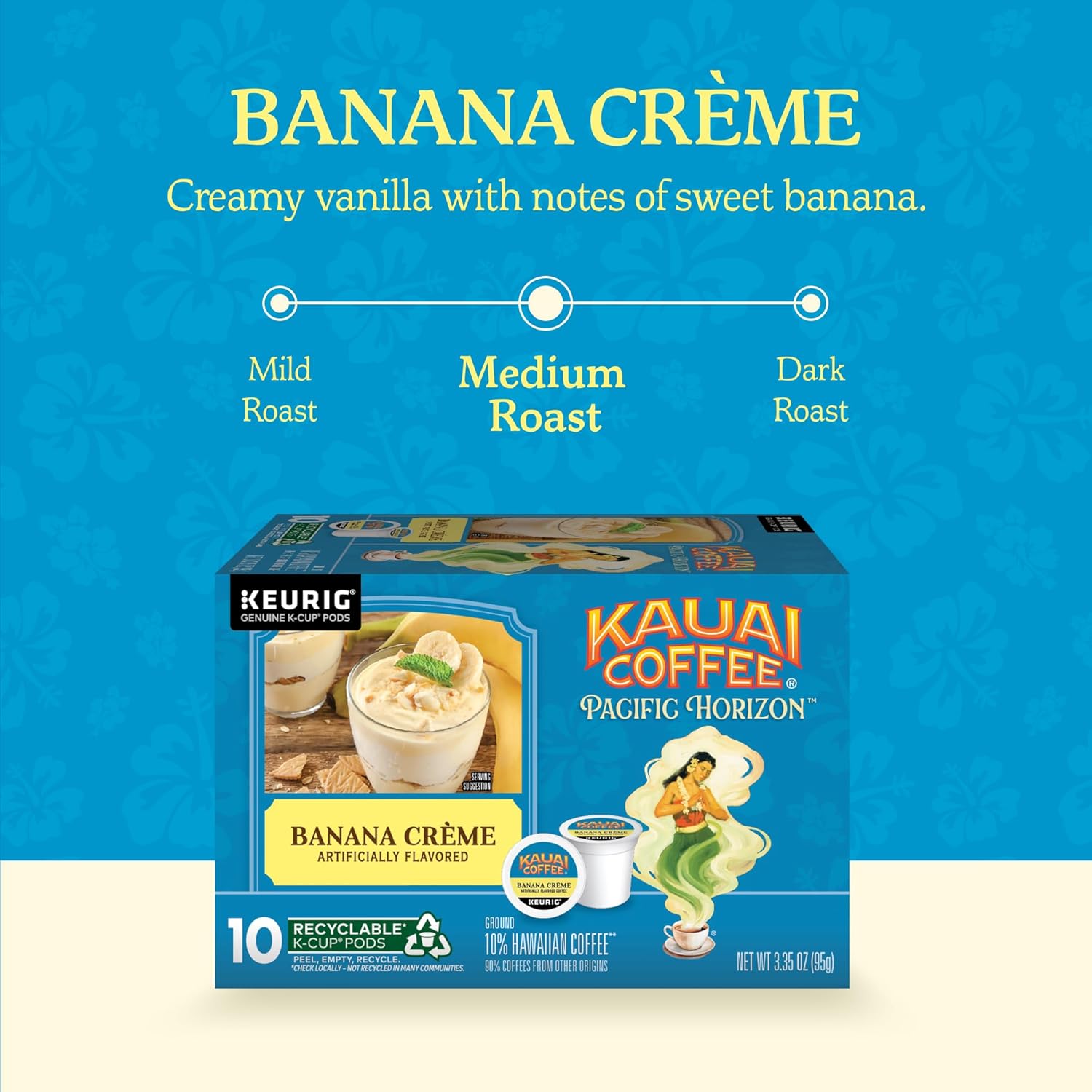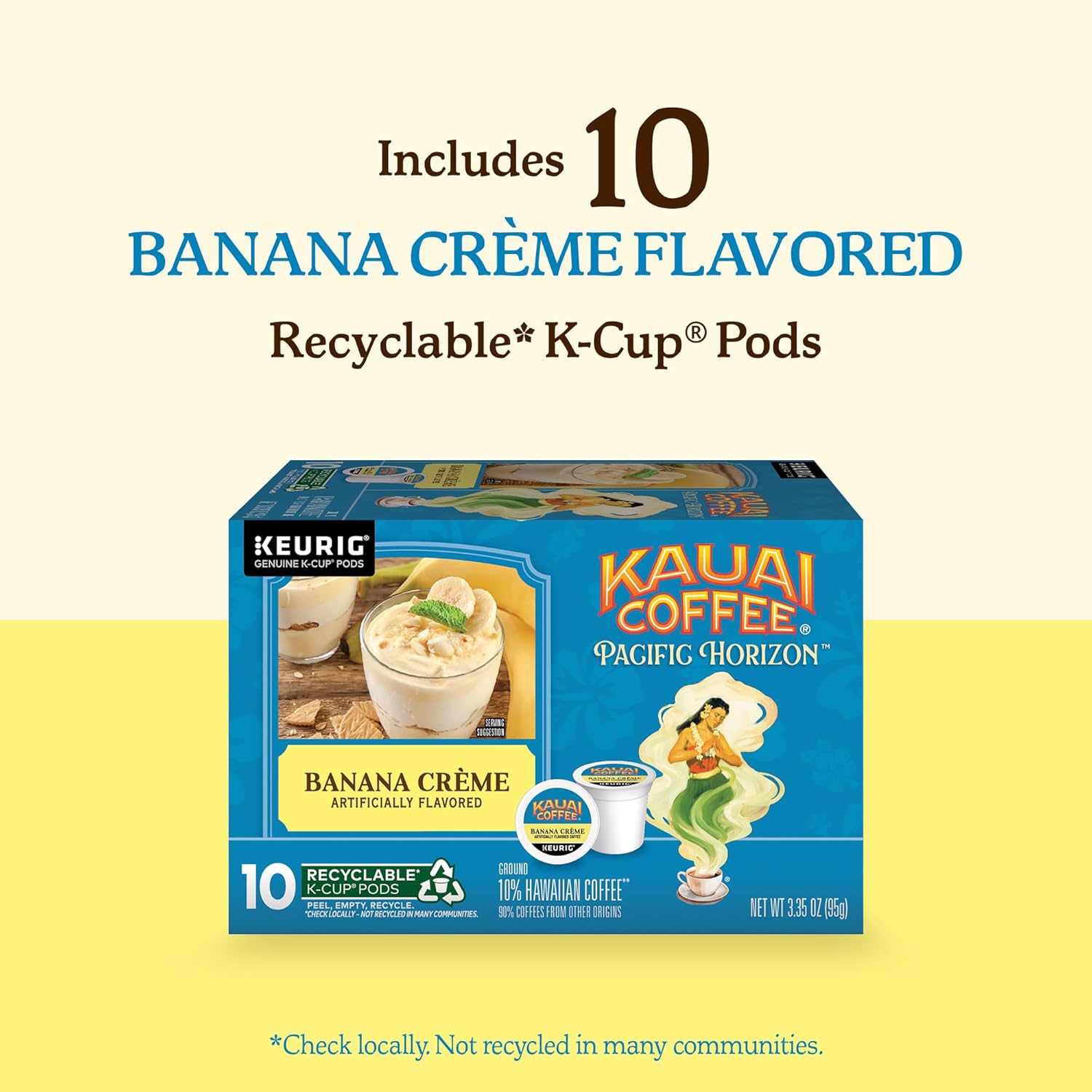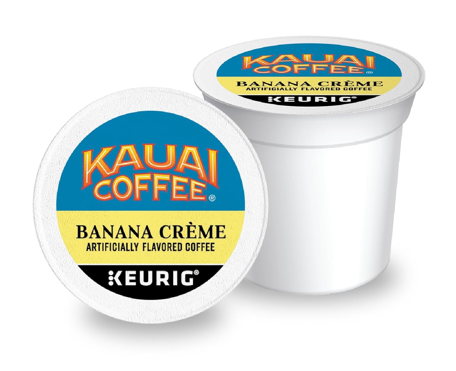 Discover the tropical delight of Kauai Coffee Banana Crème Medium Roast, a unique coffee experience tropical flavor of bananas combined with creamy vanilla. Made with 10% Hawaiian-origin Arabica beans sourced from the fertile volcanic soil of Kauai, this coffee delivers a rich and flavorful cup without bitterness. Ideal for single serve coffee enthusiasts, these coffee pods are made for Keurig coffee makers, bringing you a taste of paradise with every cup. Kauai Coffee offers a smooth coffee experience, perfect for those seeking a balance between bold and mild flavors. Whether you're starting your day or enjoying an afternoon treat, Kauai Coffee will transport you to Hawaii’s largest coffee estate. Choose a more eco-friendly way to enjoy your coffee with our recyclable pods but make sure to check locally, not recycled in many communities, as recycling options may vary. The Kauai Coffee dedication to quality is evident in each cup, ensuring a consistent and satisfying brew made with Arabica coffee. Enhance your coffee ritual with the best coffee that not only provides exceptional taste but also contributes to sustainable practices. Embrace the spirit of the island and indulge in an experience that invigorates your senses and elevates your day with its decadent flavor.