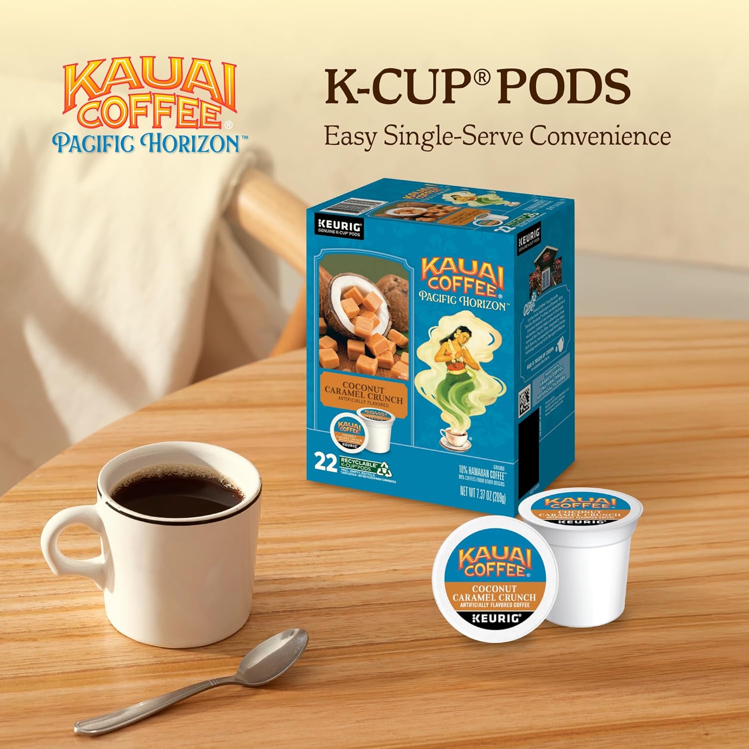 Kauai Coffee K-Cup Pods for Keurig Brewers – Arabica Coffee, 10% Hawaiian – Medium Roast, Nutty Caramel with Tropical Coconut – Coconut Caramel Crunch, 1 Pack of 22 Single Serve K-Cups