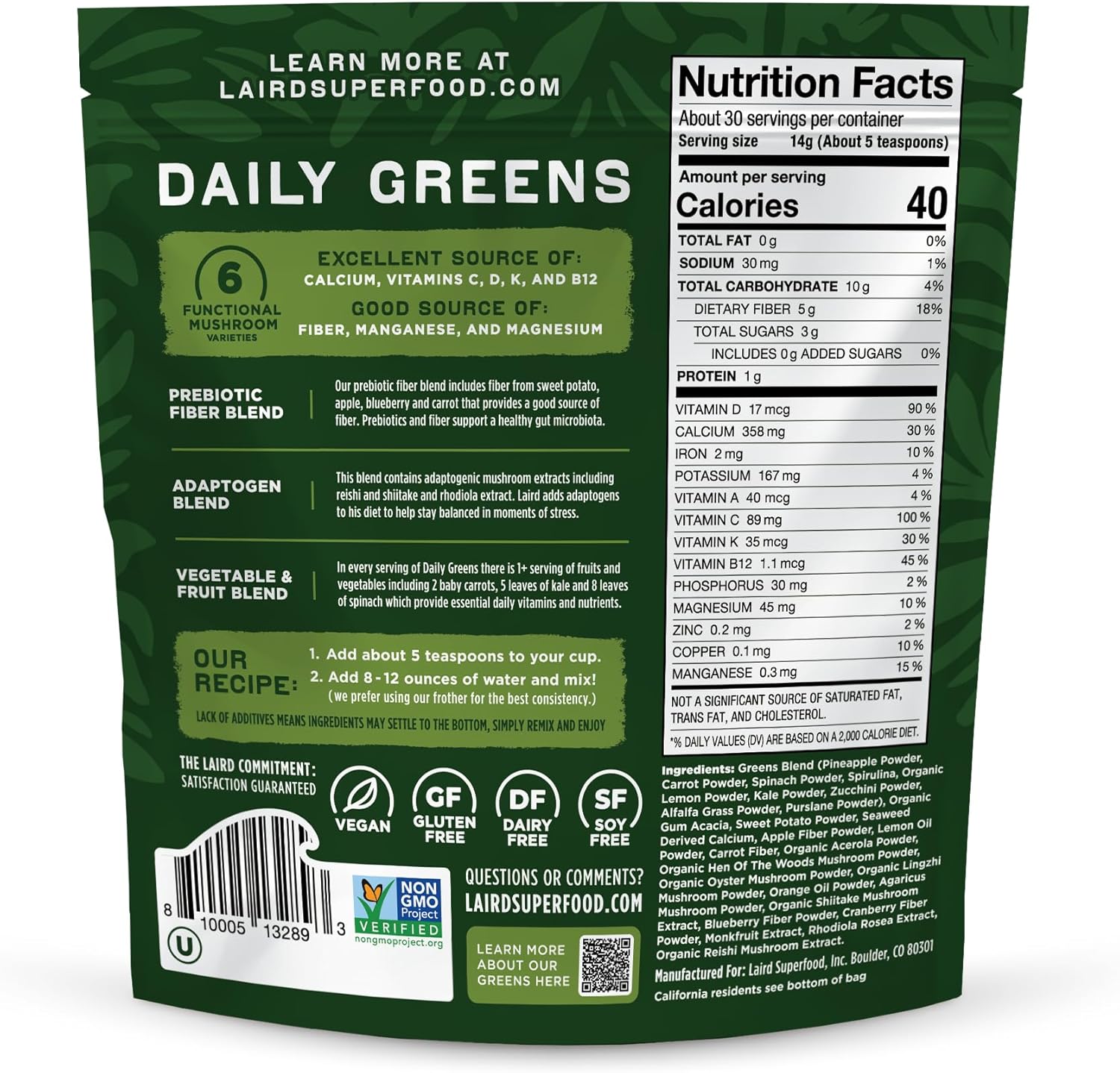 - Our Daily Greens powder is an excellent source of calcium and vitamins C, D, K and B12. Good source of Fiber, Manganese and Magnesium.