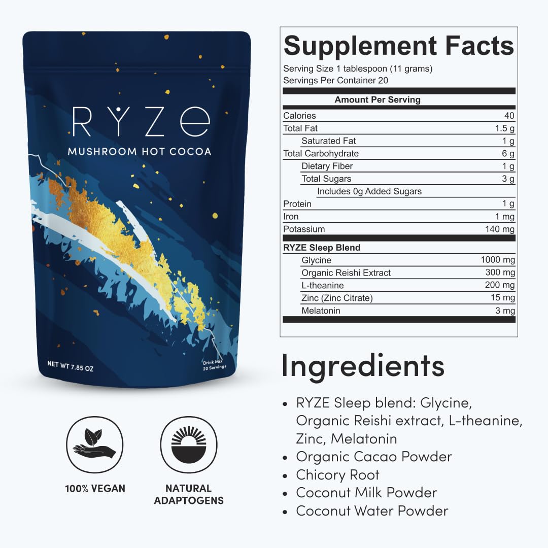 • FALL ASLEEP EFFORTLESSLY: thanks to the unique combination of Melatonin to help you fall asleep, Reishi Glycine, and theanine to support a calm/ relaxed mind and body, RYZE Hot Cocoa helps you wind down and helps fall asleep effortlessly.