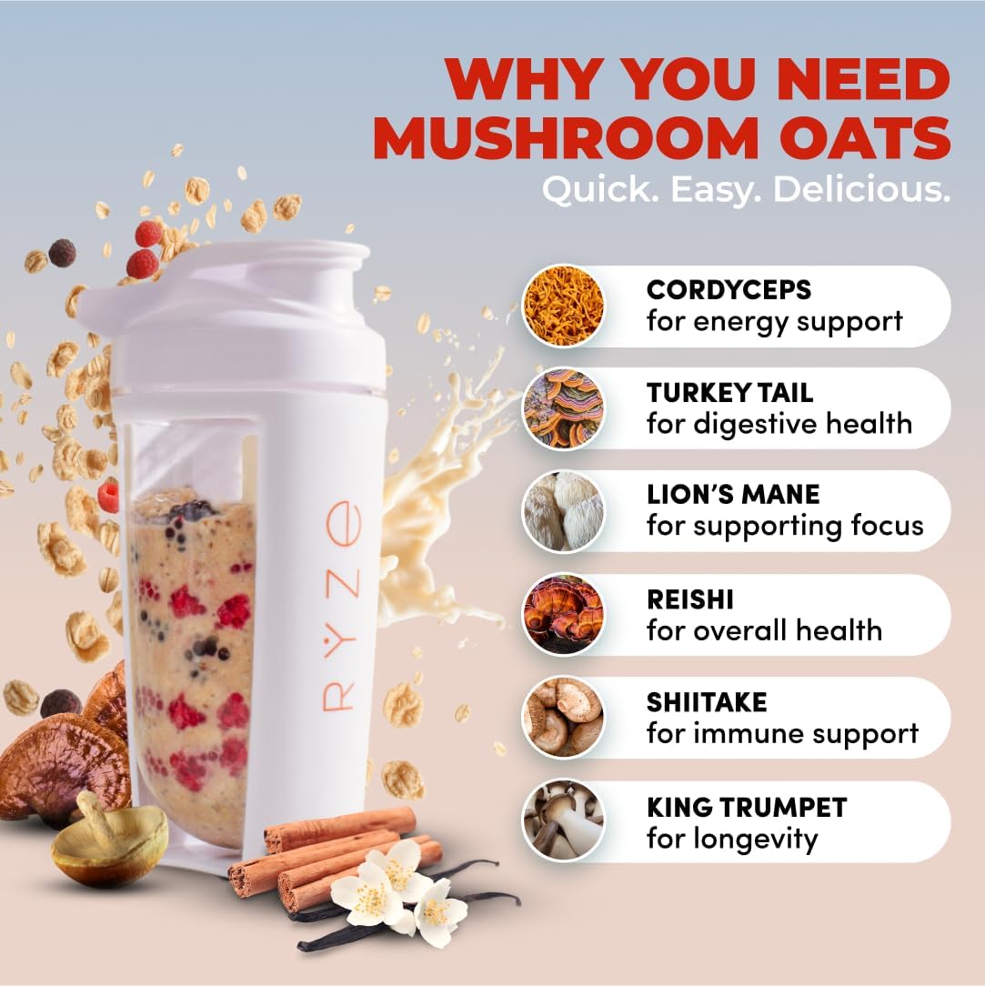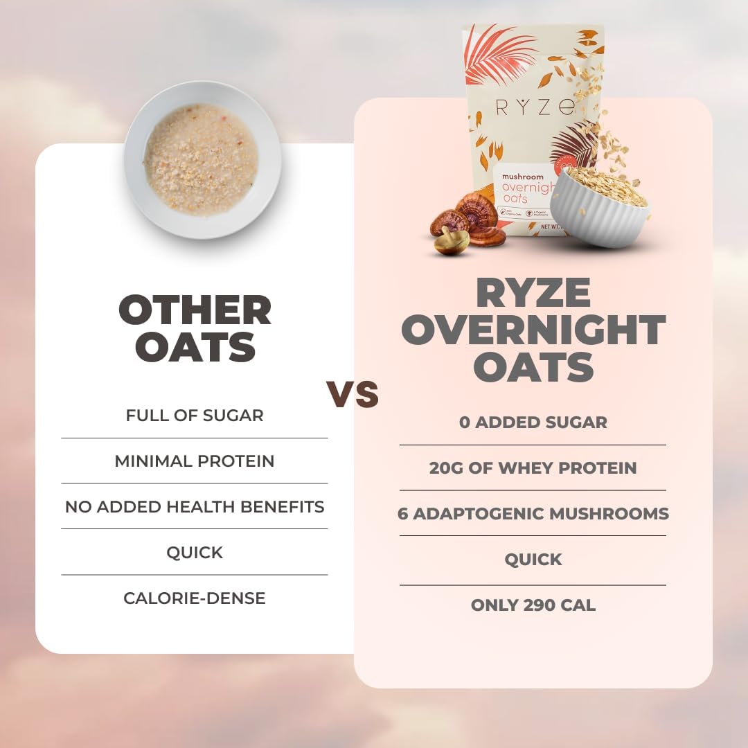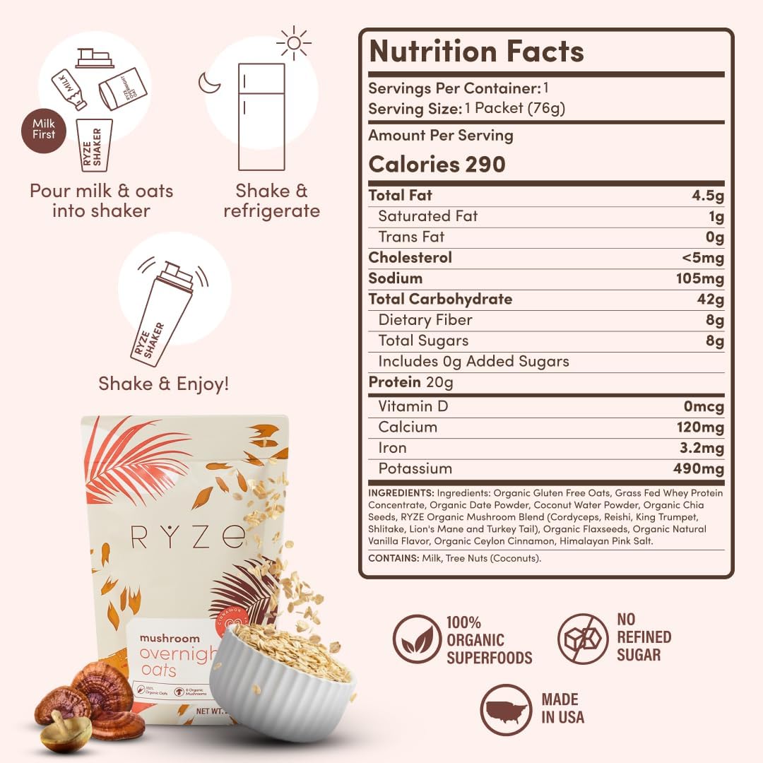 RYZE SUPERFOODS Overnight Oats are a high-protein, superfood breakfast built for busy mornings and simple meal prep. Made with gluten-free oats, 20g grass-fed whey protein, chia seeds, and 6 adaptogenic mushrooms, this overnight oats blend delivers a satisfying, high-fiber start to your day with a smooth, delicious taste.