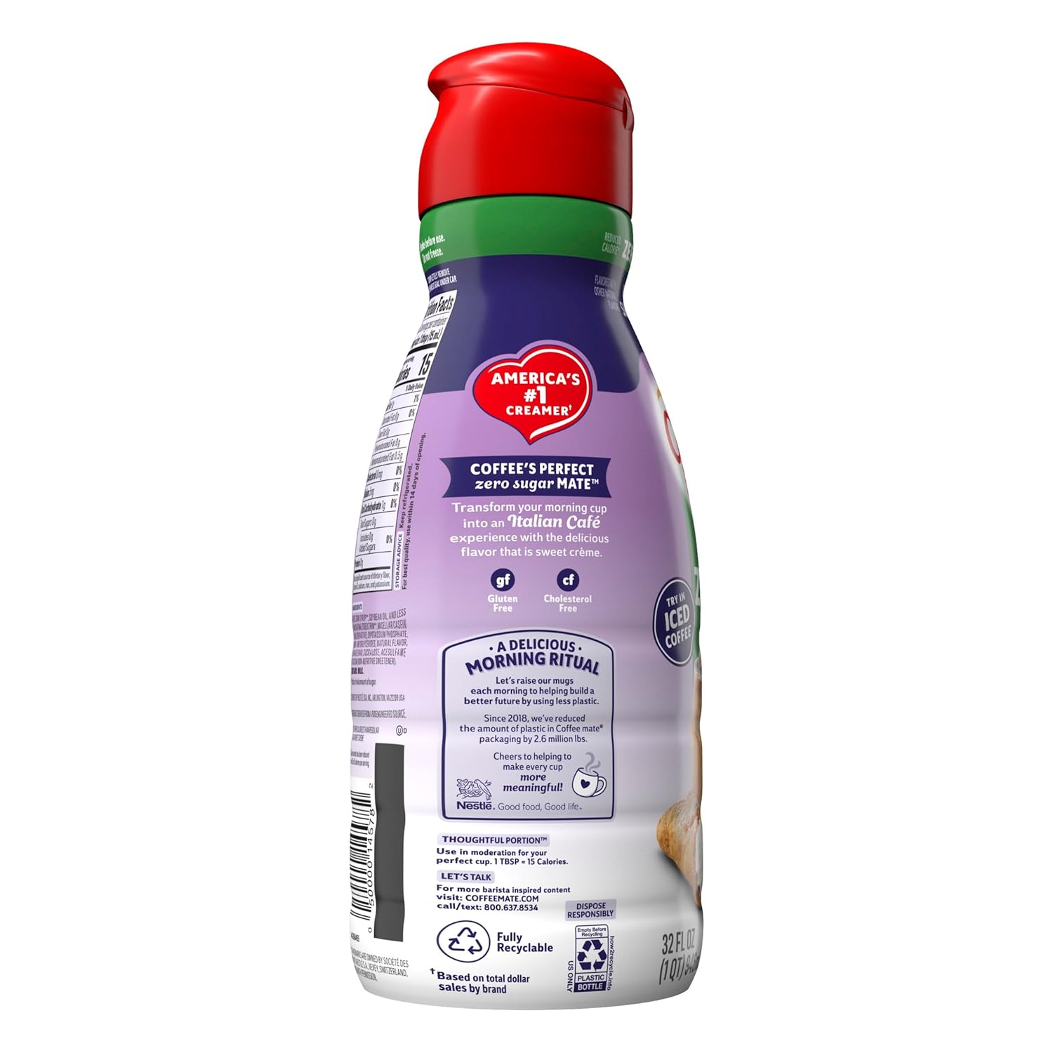 It’s time to make your coffee breaks iconic Coffee Mate Italian Sweet Crème Flavored Zero Sugar Coffee Creamer. You’re going to fall in love with our liquid coffee creamer, taking you from your early morning grind to your late-night fuel up with up to sixty-three 1 tbsp servings. We’re here for your coffee mug, your iced coffee glass and your midnight martini. Dietary restrictions? We have those covered – Our Coffee Mate liquid creamer is cholesterol-free, gluten-free, and has zero added sugar. We really like coffee, just as much as we like our recyclable packaging. Keep your zero sugar creamer cool in the fridge for up to 14 days (if you don’t finish it right away). Ready to level up your coffee game with our Italian Sweet Crème flavored coffee creamer yet? Adds a Trivial Amount of Sugar
