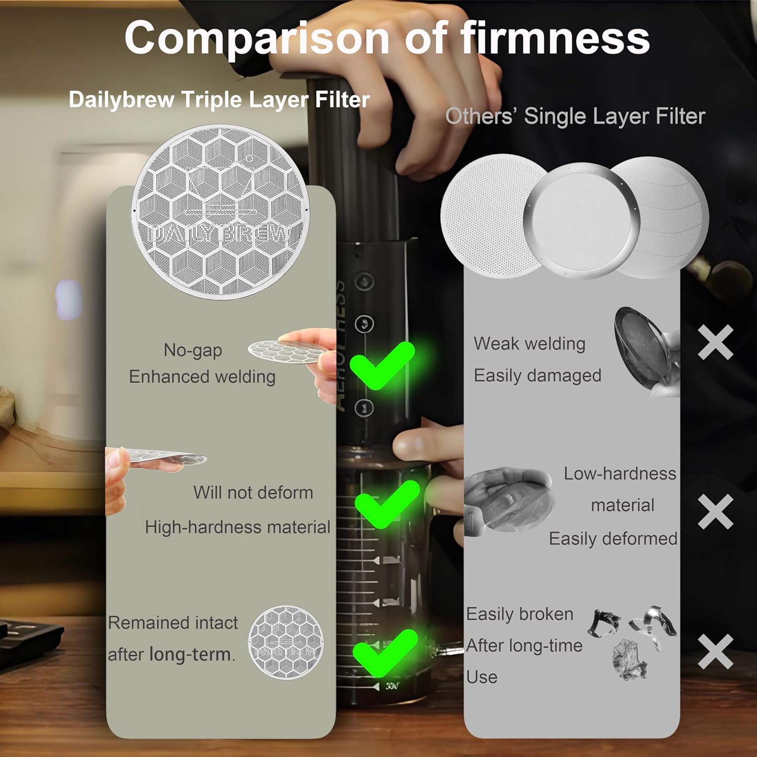 - 【Built to last】 The triple-layer coffee filter for coffee maker is crafted from food-safe stainless steel; it will never warp, dent or rust, even after thousands of presses.