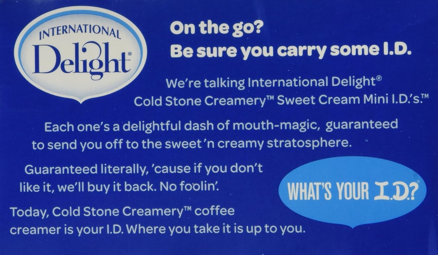 Experience the delicious and authentic flavor of these International Delight Cold Stone Sweet Cream Coffee Creamers. They're a yummy addition to coffee, tea, hot cocoa and more. The petite size of each individual pack makes them easy to take along when you're on-the-go. Stash a few in your lunch box or a break room fridge to enjoy anytime. They're free from gluten, lactose and cholesterol and have 0g of trans fat. These Cold Stone coffee creamers come in a 24 count package for convenience Ingredients: Water, Cane, Sugar, Palm Oil, Contains 2% Or Less of Each of The Following: Sodium Caseinate* (A Milk Derivative), Dipotassium Phosphate, Natural And Artificial Flavors, Sucralose, Mono And Diglycerides, Sodium Stearoyl Lactylate, Polysorbate 60, Carrageenan, Salt.