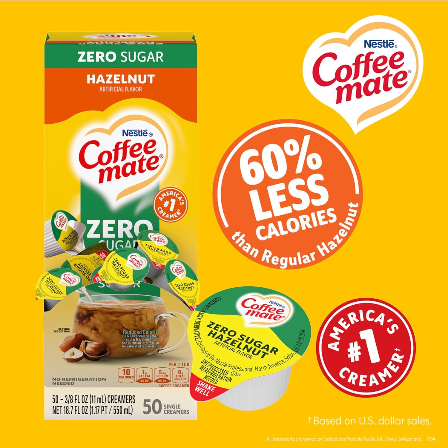 Nestle Coffee mate Zero Sugar Hazelnut flavored liquid creamer singles contain the same rich flavor, but with 55% fewer calories than our classic hazelnut creamer. Within each cup is a deliciously rich zero sugar creamer with nutty hazelnut notes that will enhance and enrich your coffee offering. Packaged in a convenient dispenser box, our liquid coffee creamer singles keep the counter clean, organized, and displayed beautifully. These creamer Singles don’t need to be refrigerated and can retain their irresistible flavor at room temperature for up to 9 months. Easy to use - just shake, open and pour. All Coffee mate foodservice single serve creamers are cholesterol-free, gluten free and kosher dairy. See the full Coffee mate ingredients statement for Coffee mate creamer ingredients. Coffee mate is America's #1 coffee creamer. With a variety of flavors and formats, Coffee mate has your coffee creamer needs covered. Delight your employees, customers and guests by offering Coffee mate liquid creamer in your workplace, break room or kitchen.