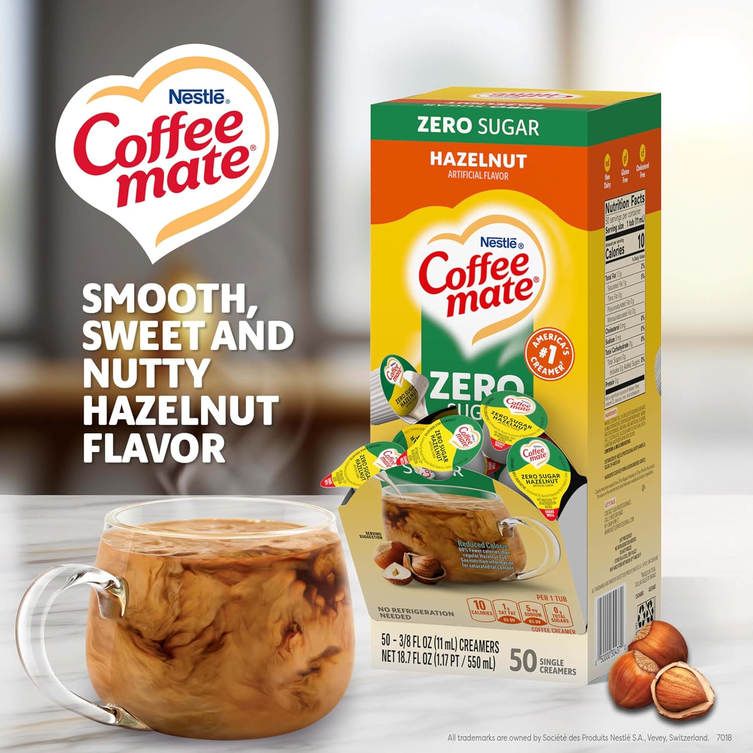 - Flavored Coffee Creamer: Nestle Coffee mate Sugar Free Hazelnut flavor coffee creamers add the rich, velvety smooth flavor with notes of sweet, nutty hazelnut you love to your cup of coffee, but with 55 percent fewer calories