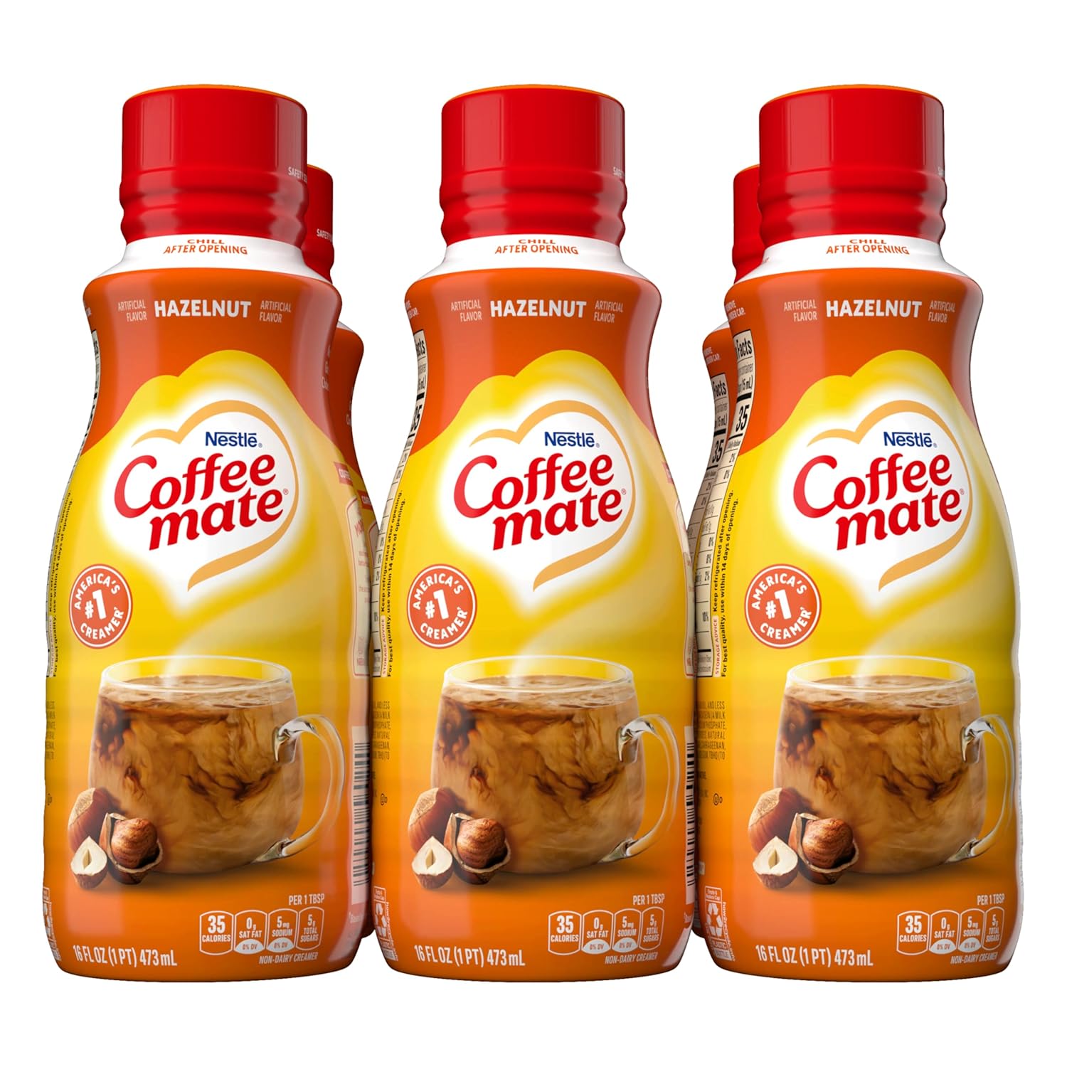Nestle Coffee Mate Liquid Hazelnut Creamer for Coffee (16 oz): Have a delightful moment at any time of the day with Coffee mate coffee creamer hazelnut liquid. Unlike powdered coffee creamers that take time to dissolve, Coffee mate liquid creamer instantly makes a sweet, delicious hazelnut cappuccino or latte, rich and tasteful as milk, without lactose, gluten, or cholesterol. With Coffeemate coffee creamer non dairy liquid, add a flavorful hint of hazelnut to your morning or afternoon-break coffee for a relaxing, warm drink. Choose your favorite flavor within our assorted coffee creamer variety pack: Coffee mate Original Coffee Creamer, French Vanilla, Italian Sweet Cream, Hazelnut, and French Vanilla Sugar Free Liquid Coffee Creamer. Coffeemate creamer lasts up to 63 servings. Wake up your coffee with Nestle coffee mate creamer and enjoy its velvety goodness in the morning, at noon, or night! Store coffee mate creamer liquid in the refrigerator after opening.