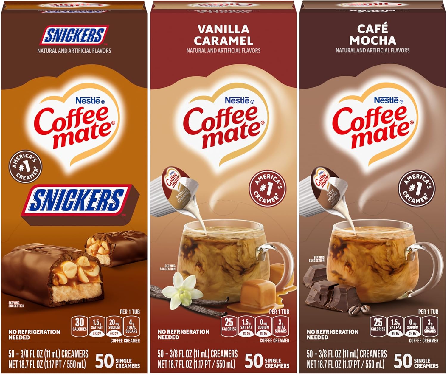 - 3 - 50 ct boxes Nestle Coffee mate liquid creamer singles; 1 of each flavor: Snickers, Vanilla Caramel, Cafe Mocha (Packaging may vary)