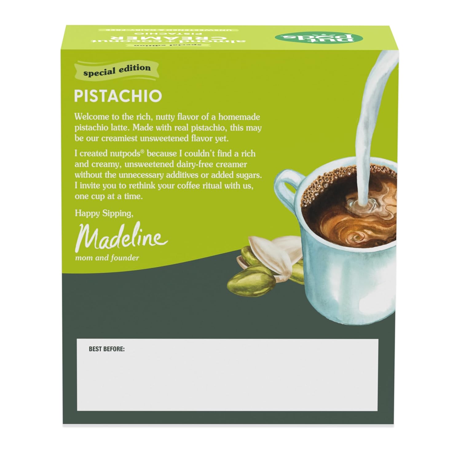 - Unsweetened – No sugar bomb here, nutpods Pistachio flavored coffee creamer is unsweetened with no sweeteners or added sugars, for a deliciously subtle flavor that allows your coffee to shine through.