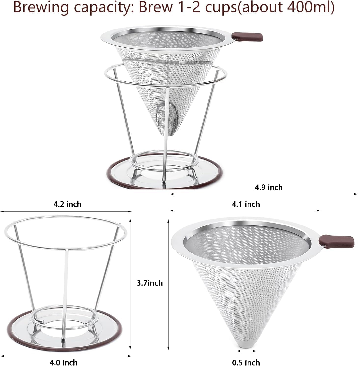 HAPYHOOM Pour Over Coffee Dripper Stainless Steel Coffee Filter Metal Cone Filter Paperless Reusable Single Cup Maker 1-2 Cup With Non-slip and Removable Cup Stand