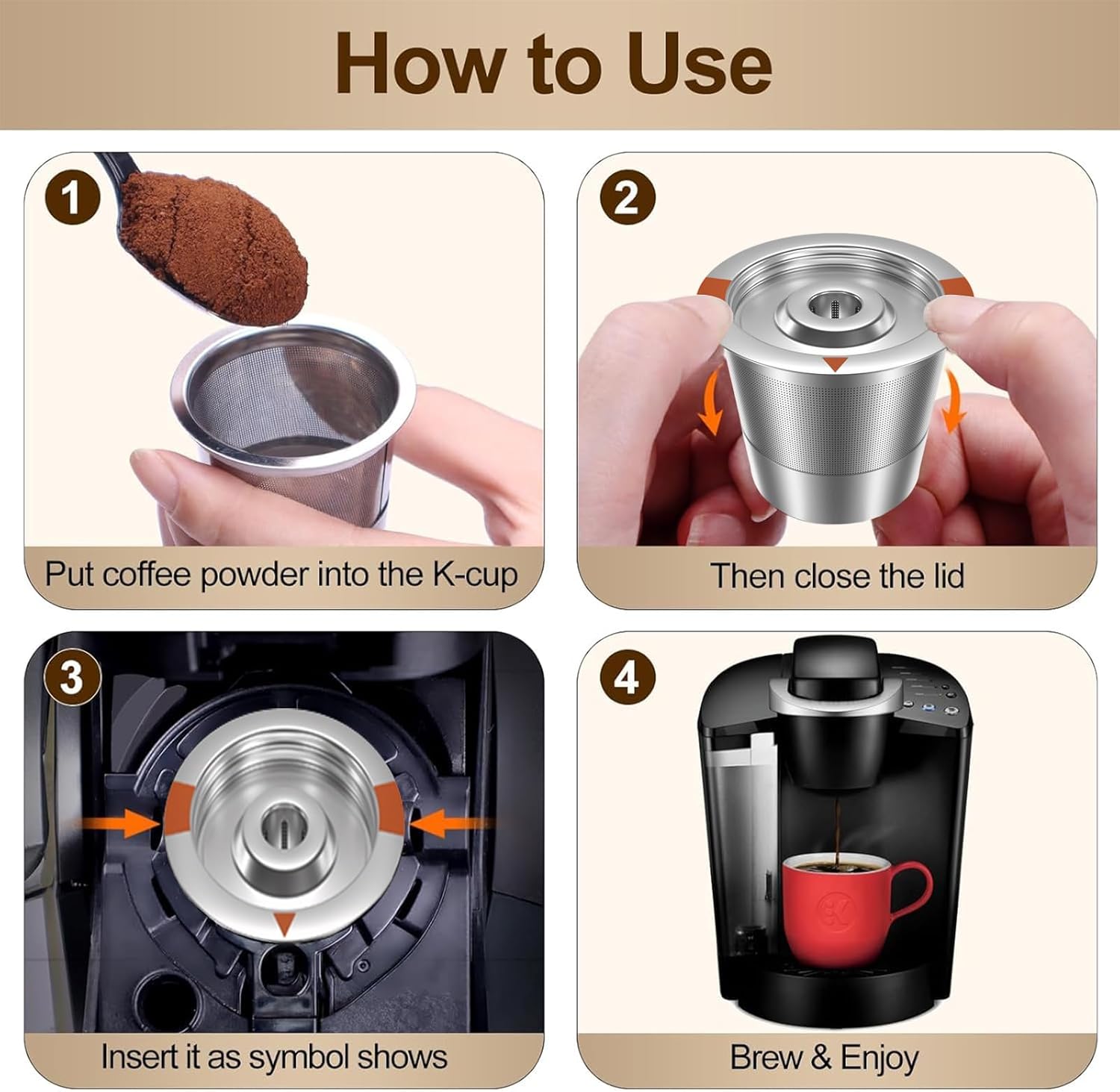 - PACKAGING: This reusable K Cups includes a stainless steel K-Cups and a rubber ring. The stainless steel material allows this filter cup to reusable, and the rubber ring is designed to make this K-Cups more snug to prevent leaks.
