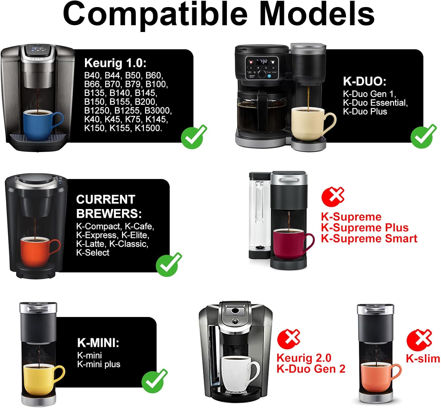 - Multi-System Fit: This coffee pods is fully compatible with K-Mini, K-Express, K-Classic, K-Elite, K-Latte, K-Cafe, K-Select, K-Compact,K-Duo Gen1, Also work with Keurig 1.0 brewers featuring SingleStream technology: B40/K40/K45, B44/B50/B60, B66/B70/K75, B77/B79/B100, B135/B140/B145, K145/B150/K150, B155/K155/B200, B1250/B1255/B3000, K1500, bringing fresh coffee convenience to multiple setups. Please note: Not compatible with Keurig 2.0 coffee maker or K-Supreme/Plus/Smart, K-Slim,k-Duo Gen 2