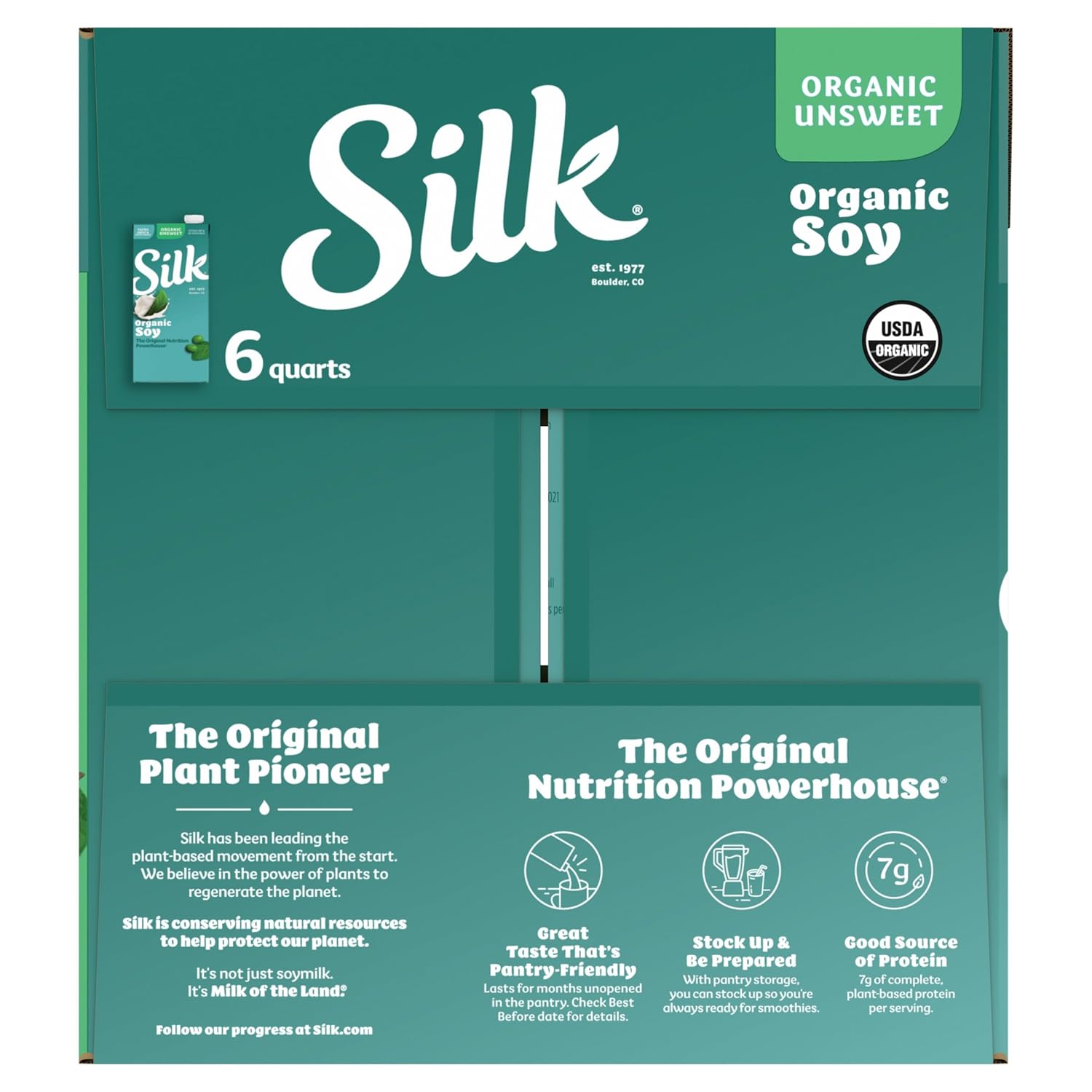 Bring the creamy goodness of Soymilk to your pantry with Silk Shelf-Stable Unsweetened Organic Soymilk. Made with whole-harvested soybeans and zero grams added sugar*, this organic Soymilk offers great taste anywhere you typically enjoy dairy milk--over your cereal, in your coffee, or simply by itself. It makes a perfect non-dairy alternative to milk, and is totally free of dairy, lactose, carrageenan, gluten, casein, egg, peanut, and MSG. A powerhouse of nutritional goodness, Silk Organic Soymilk contains absolutely no added sugar and is a good source of heart-healthy soy protein.** And since it comes in special, shelf-stable packaging, this plain Soymilk will keep fresh at room temperature, unopened, until the date code: no refrigeration necessary! *Not a reduced calorie food. See nutrition panel for information on sugar and calorie content. **In a diet low in saturated fat and cholesterol, 25 grams of soy protein per day may reduce the risk of heart disease. A serving of Silk Unsweetened Soymilk has 8 grams.
