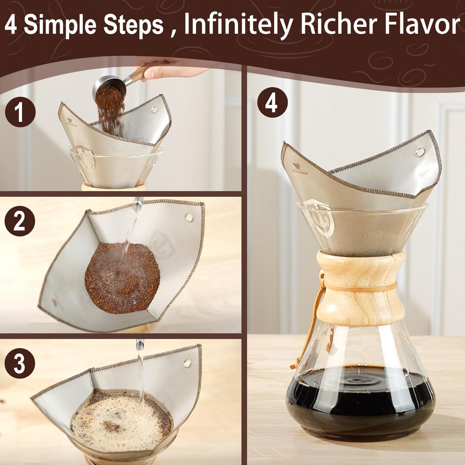- 【One-Second Setup with Hanging-ears】The stainless steel hanging-ears let you effortlessly snap the filter onto any hourglass-style carafe (6/8/11 cup models). No slipping, no adjusting – just secure it and brew. Even first-time users get it right every time.