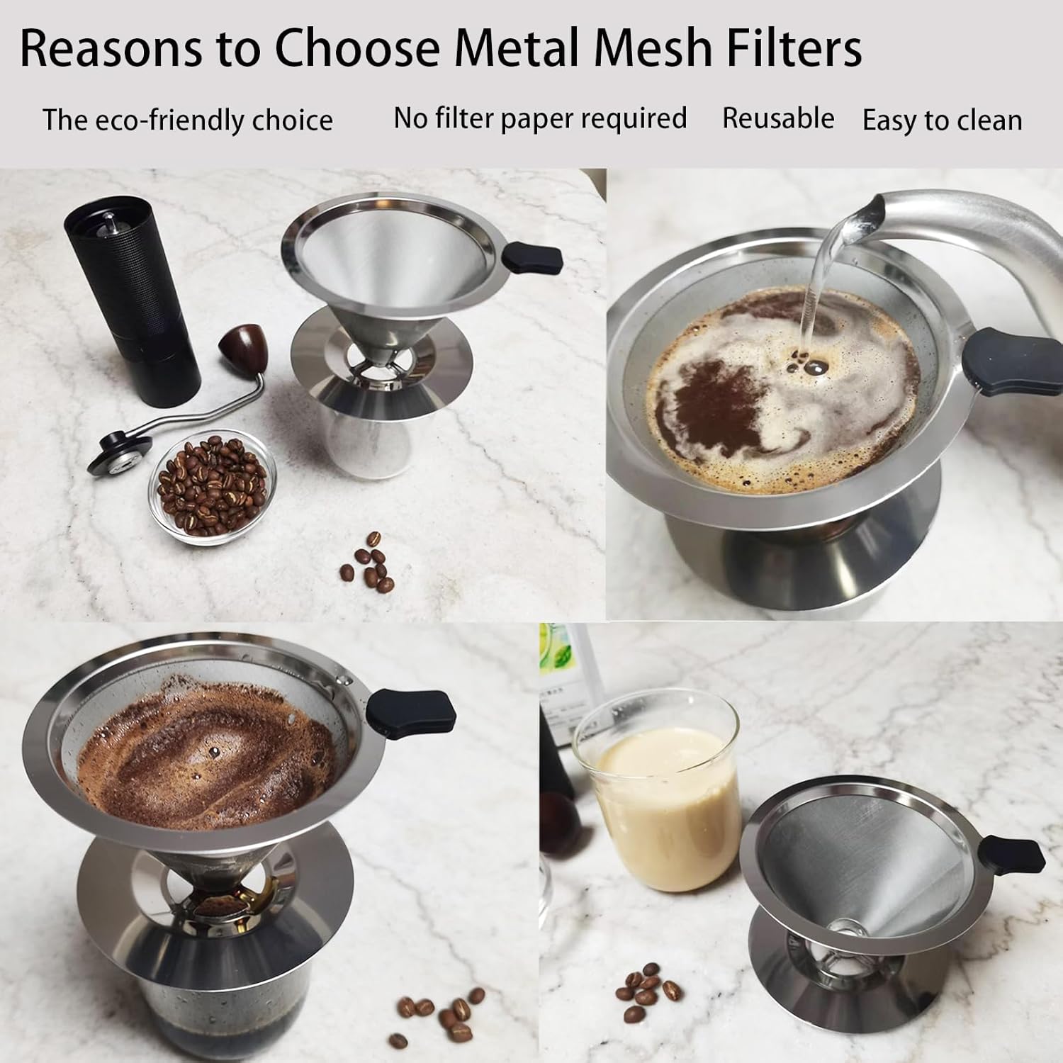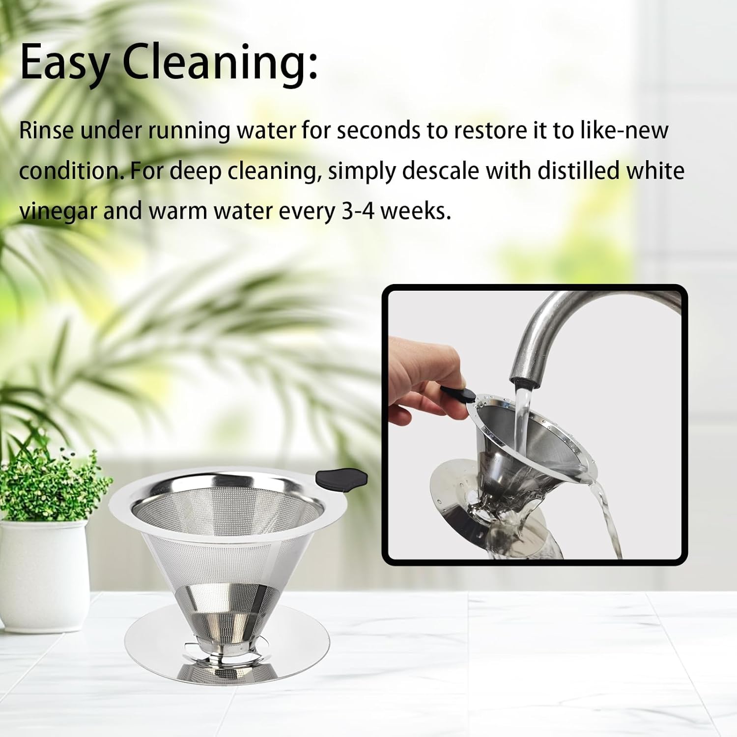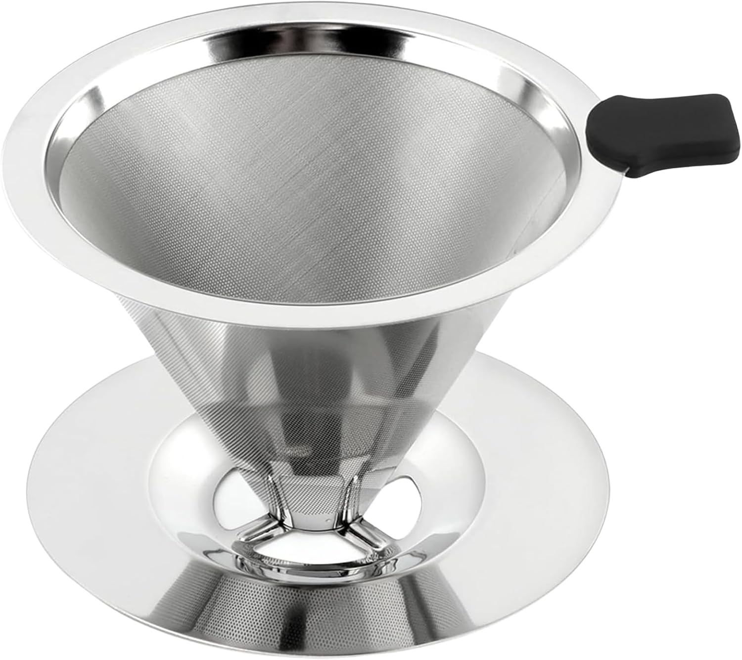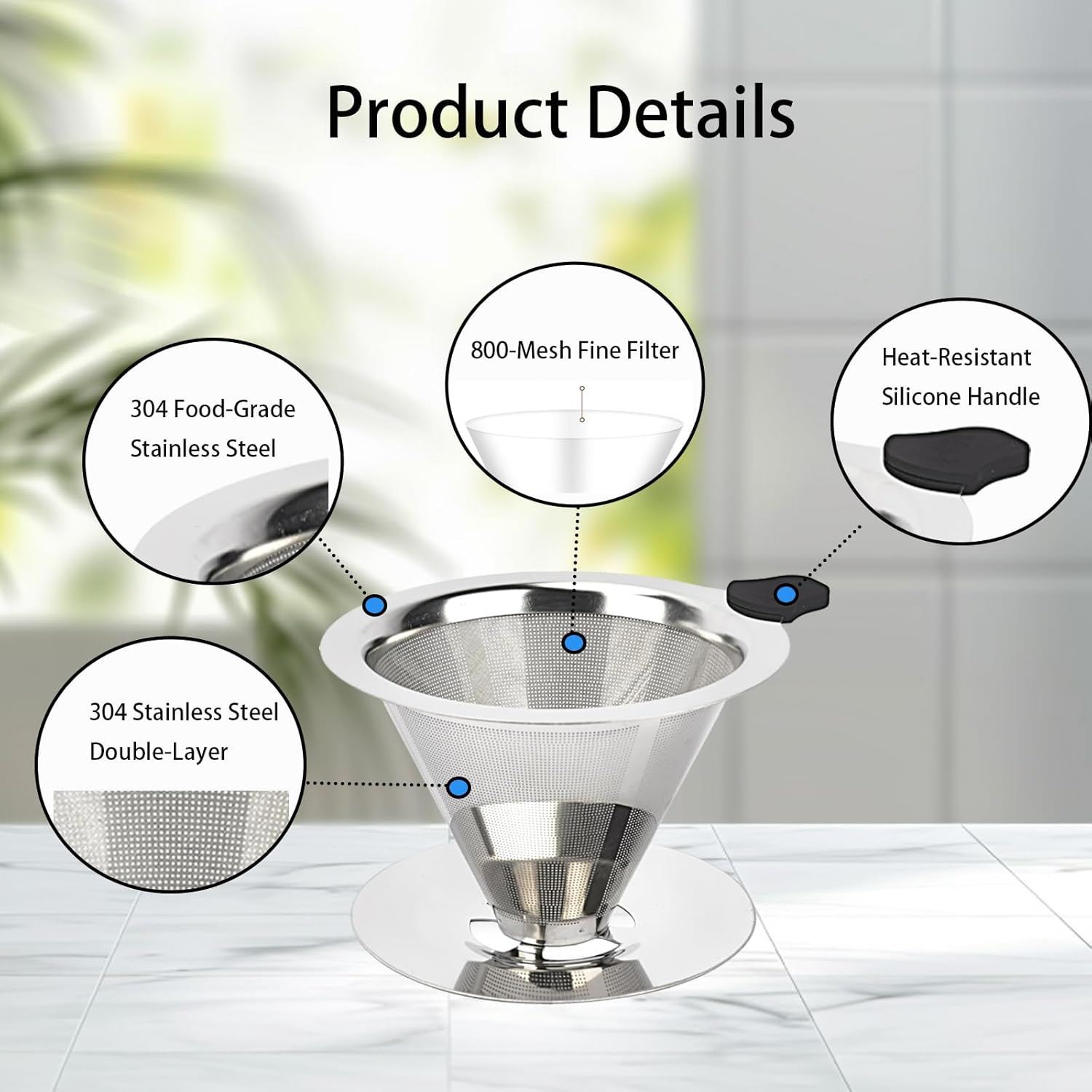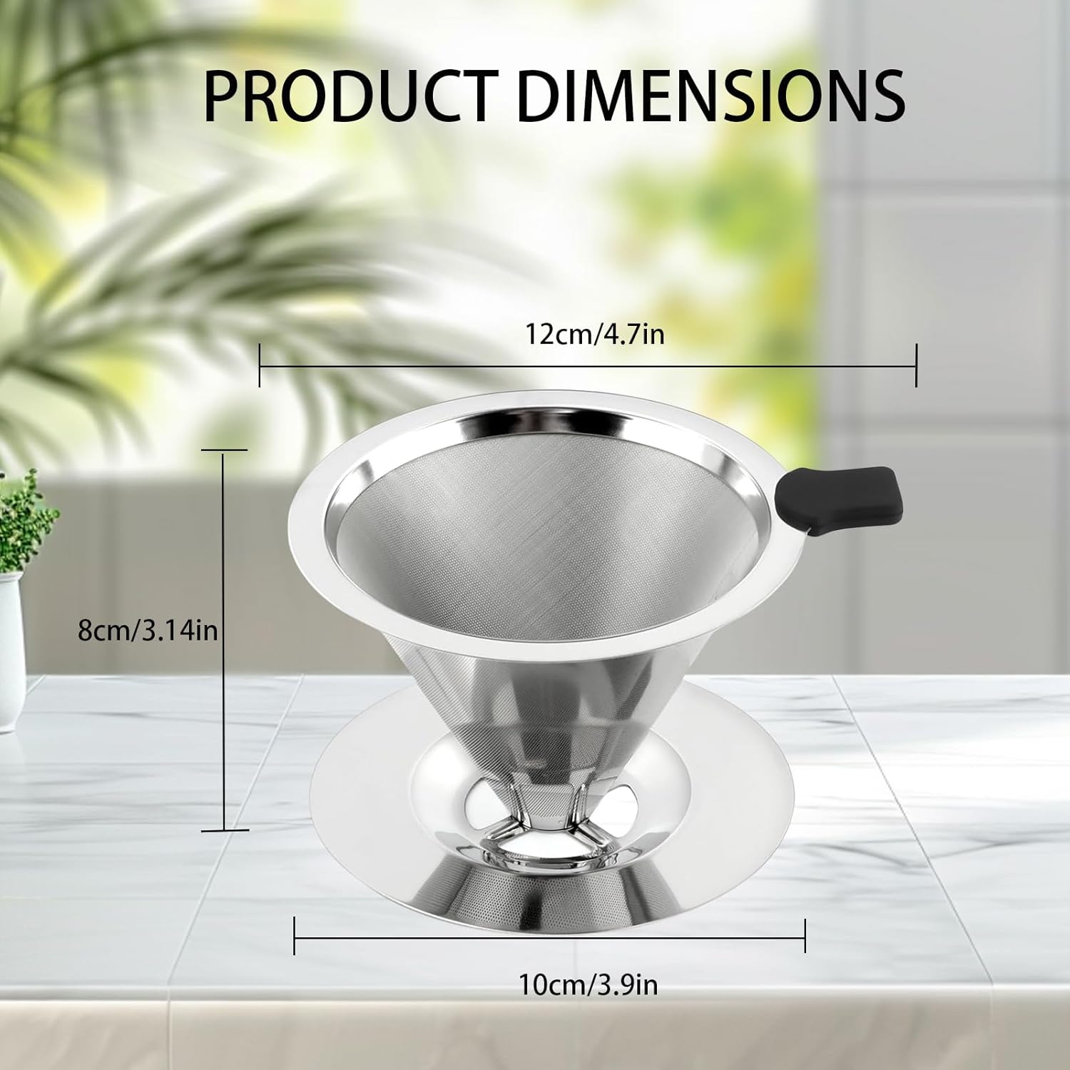 - The pour-over coffee filter features a 4-inch wide base design for stable compatibility with various cup sizes. The non-slip, heat-resistant silicone handle ensures stability during brewing and effectively prevents accidental spills.
